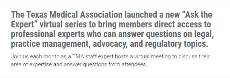 Today’s “Ask the Expert” subject “How to Delegate to Non-physician Practioners” will be available On-Demand in a couple weeks. The link to access the recording will be www.texmed.org/asktheexpert.