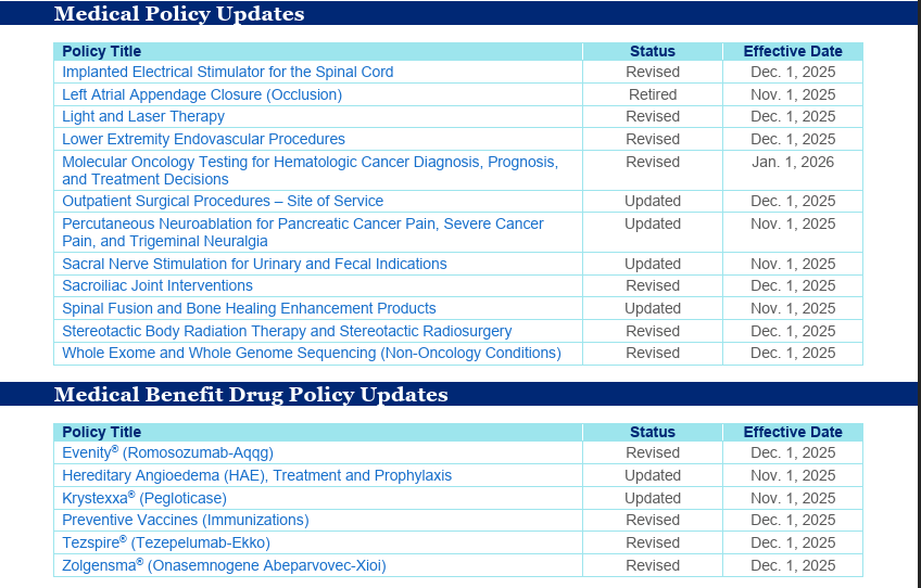 A list of recently approved, revised, and/or retired Medical Policies and/or Medical Benefit Drug Policies is provided below for your reference. For a comprehensive summary of the latest updates, refer to the Medical Policy Update Bulletin: November 2025.