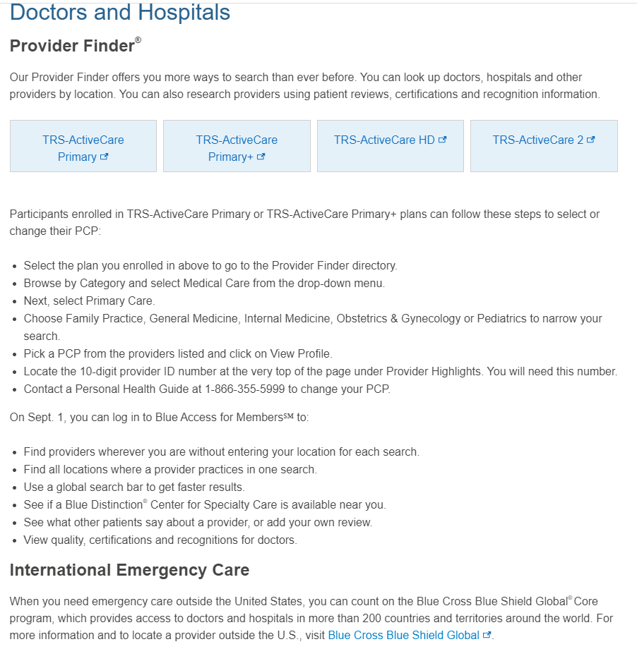Below are two screenshots with notes that may help you field calls today. They are taken from the BCBS/TRS Employee Website: https://www.bcbstx.com/trsactivecare/doctors-and-hospitals